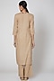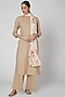 Featuring a beige kurta in cotton silk base with embroidery. It is paired with matching pants and dupatta.