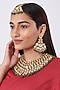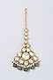 House of Vastraa presents a gold finish necklace studded with kundan polki and green beads, set in mixed metal. It is paired with a matching pair of earrings and a maang tikka.