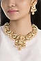 House of Vastraa presents a gold finish carved temple necklace studded with faux pearls, set in mixed metal. It is paired with a matching pair of earrings.