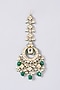 House of Vastraa presents a gold finish choker necklace studded with kundan polki and dark green beads, set in mixed metal. It is paired with a matching pair of earrings and a maangtikka.