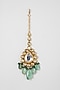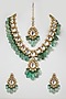 House of Vastraa presents a gold finish necklace studded with kundan polki and green beads, set in mixed metal. It is paired with a matching pair of earrings and a maang tikka.