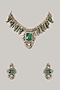 House of Vastraa presents a gold finish necklace studded with green stone, set in mixed metal. It is paired with a matching pair of earrings. It is a true testament to the artistry of India's rich cultural heritage, ideal for festive occasions and wedding celebrations.