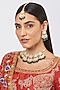 House of Vastraa presents a gold finish choker necklace studded with pachi kundan polki and green stones, set in mixed metal. It is paired with a matching pair of earrings and a maangtikka.