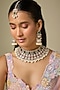 House of Vastraa presents a gold finish necklace studded with kundan polki and emerald synthetic stones, set in brass. It is paired with a matching pair of earrings and a maangtikka. It is a true testament to the artistry of India's rich cultural heritage, ideal for festive occasions and wedding celebrations.
