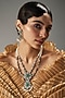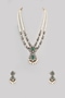 House of Vastraa presents a gold finish long necklace studded with kundan polki and green stones, set in mixed metal. It is paired with a matching pair of earrings. This necklace set is a true testament to the artistry of India's rich cultural heritage, ideal for festive occasions or wedding celebrations.