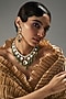 House of Vastraa presents a gold finish necklace studded with kundan polki and green stones, set in mixed metal. It is paired with a matching pair of earrings. This necklace set is a true testament to the artistry of India's rich cultural heritage, ideal for festive occasions or wedding celebrations.
