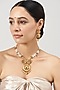 House of Vastraa presents a gold finish long temple necklace studded with kundan polki and pearls. It is paired with a matching pair of earrings.