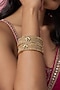 House of Vastraa presents a pair of gold finish temple bangles studded with kundan polki and multi-colored stones, set in mixed metal. These bangles are a true testament to the artistry of India's rich cultural heritage, ideal for festive occasions or wedding celebrations.