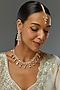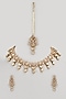 House of Vastraa presents a gold finish necklace studded with kundan polki, set in mixed metal. It is paired with a matching pair of earrings and a maangtikka. This necklace set is a true testament to the artistry of India's rich cultural heritage, ideal for festive occasions or wedding celebrations.