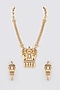 House of Vastraa presents a gold finish long temple necklace studded with kundan polki and ruby synthetic stones, set in mixed metal. It is paired with a matching pair of earrings. It is a true masterpiece that celebrates the beauty and grace of Indian culture, making it a cherished addition to your jewellery collection.