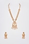 House of Vastraa presents a gold finish temple long necklace studded with multicolored stones, set in mixed metal. It is paired with a matching pair of earrings. It is a true testament to the artistry of India's rich cultural heritage, ideal for festive occasions and wedding celebrations.