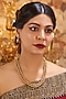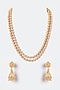 House of Vastraa presents a gold finish temple mala studded with kundan polki, set in mixed metal. It is paired with a matching pair of earrings. This mala set is a true testament to the artistry of India's rich cultural heritage, ideal for festive occasions and wedding celebrations.
