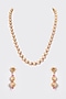 House of Vastraa presents a gold finish temple mala studded with kundan polki, set in mixed metal. It is paired with a matching pair of earrings. This necklace set is a true testament to the artistry of India's rich cultural heritage, ideal for festive occasions and wedding celebrations.