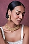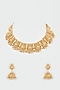 House of Vastraa presents a gold finish temple necklace studded with kundan polki, set in mixed metal. It is paired with a matching pair of earrings.