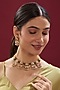 House of Vastraa presents a gold finish temple necklace studded with kundan polki, green and red synthetic stones, set in mixed metal. It is paired with a matching pair of earrings. It is a true masterpiece that celebrates the beauty and grace of Indian culture, making it a cherished addition to your jewellery collection.
