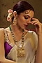 House of Vastraa presents a gold finish temple long necklace studded with multi-colored stones and kundan polki, set in mixed metal. It is paired with a matching pair of earrings. This necklace set is a true testament to the artistry of India's rich cultural heritage, ideal for festive occasions or wedding celebrations.