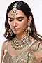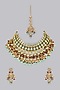 House of Vastraa presents a gold finish choker necklace studded with kundan polki, red and mint green beads, set in mixed metal. It is paired with a matching pair of earrings and a maangtikka.
