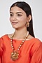 House of Vastraa presents a gold finish temple mala studded with motifs, stones and pearls, set in mixed metal. It is paired with a matching pair of earrings.