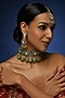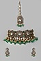 House of Vastraa presents a two tone finish choker necklace studded with kundan polki and green beads, set in mixed metal. It is paired with a matching pair of earrings and maang tikka.