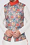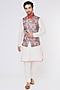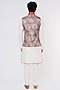 Featuring a multi-colored bundi jacket in silk base with print. It is paired with a contrasting white kurta and pants.