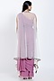 Featuring a lilac draped saree in georgette base. It is paired with a matching one-shoulder blouse and a contrasting embroidered jacket.