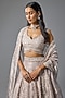 Featuring a lilac lehenga in tissue base with cutdana, pearls and sequins embroidery. It is paired with an embroidered blouse and a dupatta. Elevate the look with diamond jewellery, styled hair, block heels, a shimmer clutch, and dewy makeup for weddings, engagements, or festive soirees.