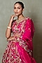 Featuring a rani pink lehenga in organza base with thread, dori, gota patti and pearl embroidery. It is paired with a blouse and a dupatta. Accentuate it with polki jewellery and block heels for weddings or a sangeet ceremony.