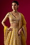 Featuring a yellow lehenga in organza base with zardosi, french knots and cutdana embroidery. It is paired with an embroidered blouse and a dupatta. Style this opulent lehenga with a choker set and a sleek bun for a royal bridal look. Ideal for your wedding day, engagement, or reception celebration.