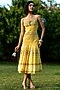 Featuring a bright yellow spaghetti dress in cotton and poplin base with print. Accentuate it with dangler earrings and heels for evening soirees, this dress blends sophistication with unique charm.