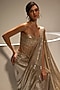 Featuring a champagne pre-draped saree in mesh and imported sequins fabric base. It is paired with a blouse. Style it with statement jewellery, block heels and an embellished clutch for sangeet ceremonies or weddings.