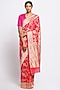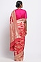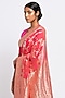 Featuring a coral handwoven banarasi saree in georgette base with floral motif detail. This timeless piece is ideal for various occasions and easy to style with different accessories.