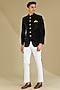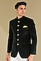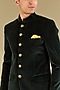 Featuring a dark green bandhgala jacket in cotton velvet base with antique gold buttons. It is paired with white cotton stretch pants and a yellow pocket square. Perfect wear for wedding ceremony or festive occasions.