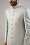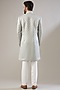 Featuring a silver-grey sherwani in jacquard poly viscose base with meenakari buttons. It is paired with a matching cotton silk kurta and contrasting off-white pants.