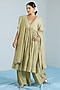 Featuring a pistachio green anarkali kurta in pure chanderi base with hand embroidery. It is paired with pants and dupatta. Accentuate it with kundan polki earrings and heels for festive gatherings or mehendi ceremonies.