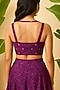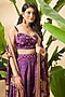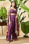 Featuring a purple cape in chinon base with ornate print, zari accents and gold motifs detailing. It is paired with a crepe blouse having a sweetheart neckline and embroidery, including draped harem pants. Accentuate it with statement earrings and strappy sandals for a vibrant look, perfect for diwali parties, sangeet nights or destination celebrations.