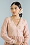 Featuring a salmon pink short flared top in pure chanderi base with hand embroidery. It is paired with pants. Accentuate it with kundan polki earrings and heels for festive gatherings or pooja ceremonies.