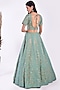 Featuring a coral blue lehenga in chiffon and net base with cutdana, dabka, and pearl floral geometric hand embroidery. It is paired with a matching blouse and a dupatta.