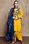 Featuring a mustard kurta in slub linen base with contrasting applique embroidery. It is paired with matching dhoti pants and a contrasting navy blue dupatta having cotton gold lines.