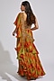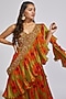 Featuring an olive and orange pre-draped gathered saree in crepe satin base with cutwork border, jaal print, thread, cutdana and sequins hand embroidery. It is paired with a silk choli having print and embroidery. Accentuate with statement jewellery and heels for a wedding, sangeet or engagement ceremony.