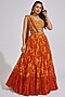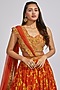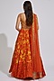 Featuring a rust and mustard yellow choli in silk base with jaal print, thread, cutdana, sequins, and mirror embroidery. It is paired with a matching printed layered skirt having embroidered attached belt and a georgette draped embroidered dupatta.