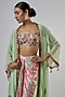 Featuring a sage cape in georgette base with geometric mirror and resham embroidery. It is paired with a raw silk embroidered tube bustier and a modal satin printed skirt. Accentuate with statement jewellery and heels for a complete look.