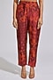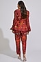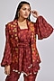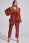 Featuring a wine waistcoat in silk base with distressed print, circular motif thread, and mirror work. It is paired with a matching crepe wrapped over kimono shirt having tie-up detailings and coin work, a silk strap bustier, and printed pants.