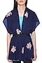 Featuring a navy blue stole in merino wool base with hand embroidered floral motifs accentuated with fabric elements and 3D embroidery.