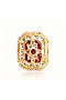 Featuring a gold finish adjustable ring studded with kundan polki, pearls and ruby stones, set in 92.5 sterling silver. Perfect for grand occasions like weddings and traditional festivities.