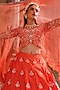 Vinita Bhansali presents an orange lehenga in pure silk base with dori, marodi, thread, sequins and pearl and floral hand embroidery. It is paired with a blouse and a pure silk organza dupatta. Style this lehenga with delicate diamond jewelry and embellished heels for an elegant wedding look.