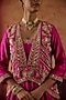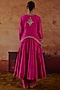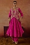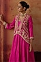 Featuring a pink jacket in pure silk organza base with sequins, marodi, mukaish and zardosi hand embroidery. It is paired with a pure silk anarkali and pants. Accentuate it with jewellery, a sleek clutch and heels for a graceful look. Perfect for special celebrations, wedding or festive ceremony.