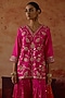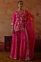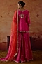 Featuring a pink kurta in pure silk base with marodi, zardosi, gota patti, sequins and mukaish hand embroidery. It is paired with sharara pants and a pure silk organza dupatta. Accentuate it with jewellery, a sleek clutch and heels for a graceful look. Perfect for special celebrations, wedding or festive ceremony.
