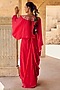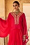 Featuring a red kaftan top in pure italian silk base with marodi, sequins, zardosi and mukaish hand embroidery. It is paired with a pure silk draped skirt and a shantoon inner. Accentuate it with statement jewellery and heels for a festive occasion, wedding or engagement ceremony.