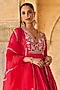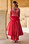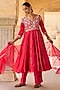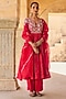 Featuring a red anarkali in pure silk base with marodi, sequins, zardosi and mukaish hand embroidery. It is paired with pants and a pure silk organza dupatta. Accentuate it with statement jewellery and heels for a festive occasion, wedding or engagement ceremony.