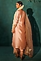 Vinita Bhansali presents a rose gold kurta in pure silk base with marodi, sequins, thread and dori embroidery. It is paired with pants and a pure silk organza leheriya dupatta. Style this kurta with traditional juttis and a matching potli bag for a timeless festive look,